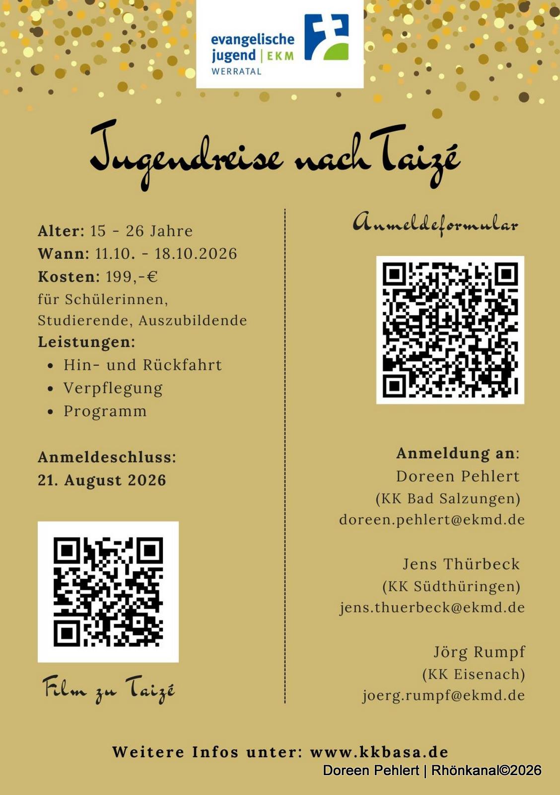 Die Evangelische Jugend Werratal bietet in den Herbstferien vom 11. Oktober bis 18. Oktober 2026 eine Reise für Jugendliche zwischen 15 und 26 Jahren nach Taizé in Frankreich an.