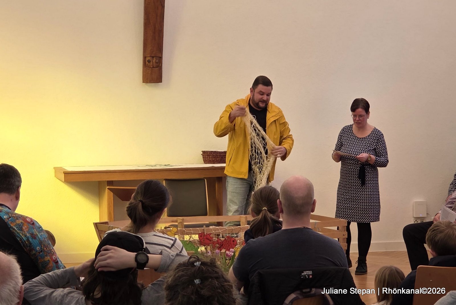 Zum Start um 14 Uhr war das Gemeindezentrum bis auf den letzten Platz gefüllt. Es gab eine Andacht, in der nicht nur die Kinder zum Mitmachen eingeladen waren. Pfarrer Karl Weber, als Petrus gekleidet, nahm die Gottesdienstbesucher mit auf seinen Fischzug.