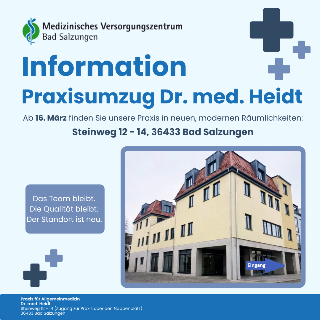 Das Medizinische Versorgungszentrum Bad Salzungen informiert über den Umzug der Praxis für Allgemeinmedizin von Dr. med. Heidt. Ab dem 16. März empfängt das Team seine Patientinnen und Patienten in neuen, modernen Räumlichkeiten im Steinweg 12–14, 36433 Bad Salzungen.