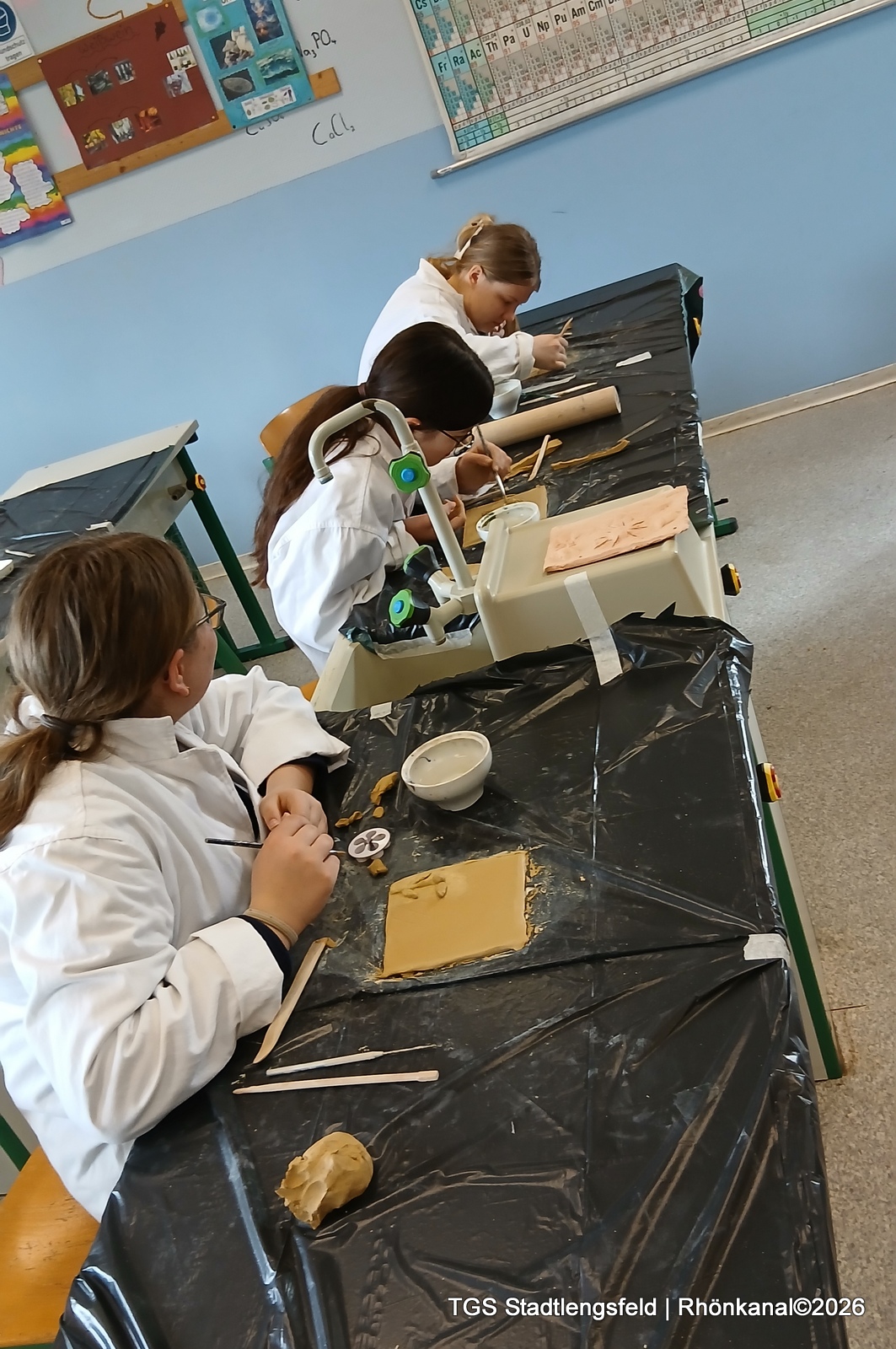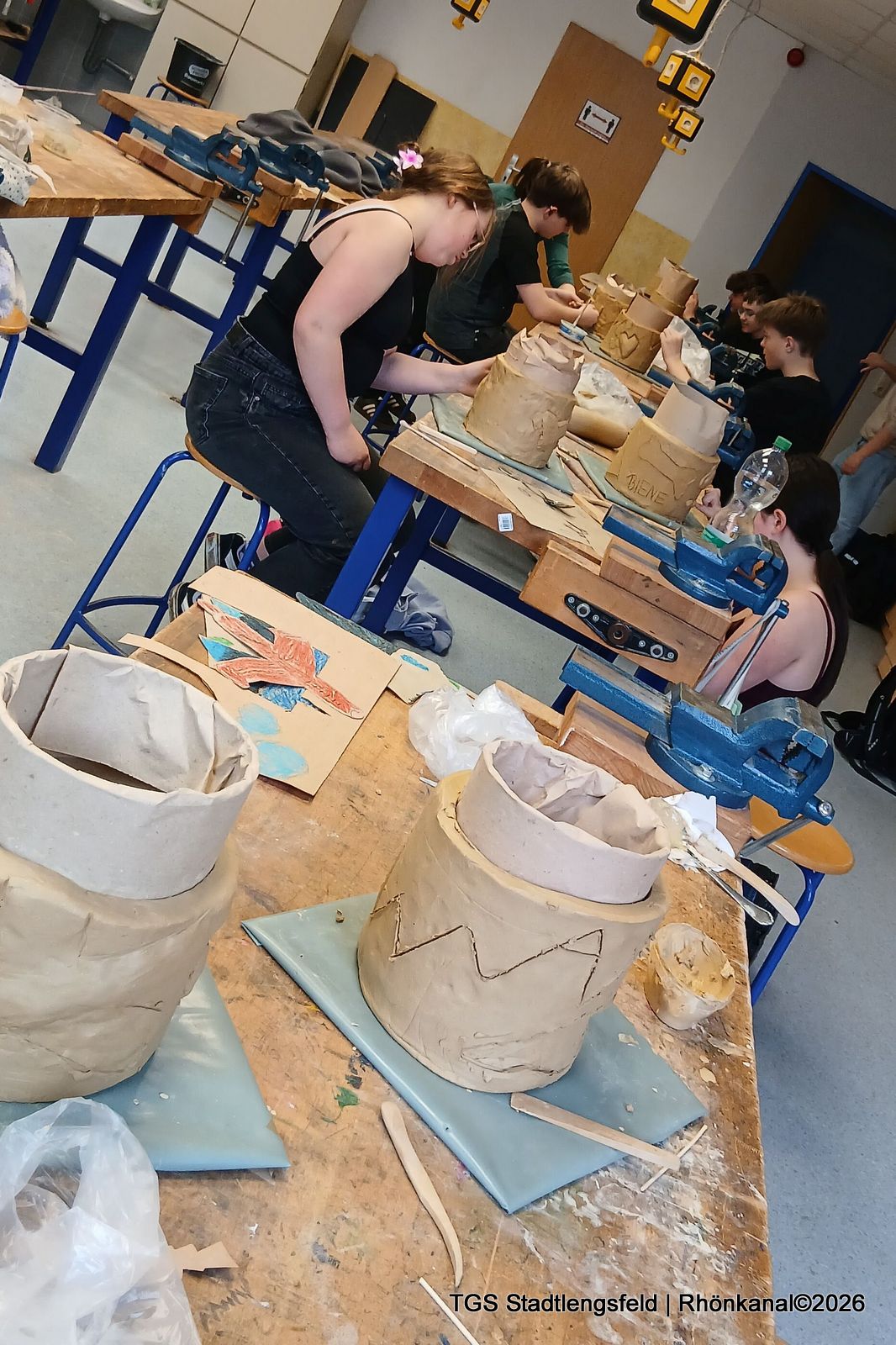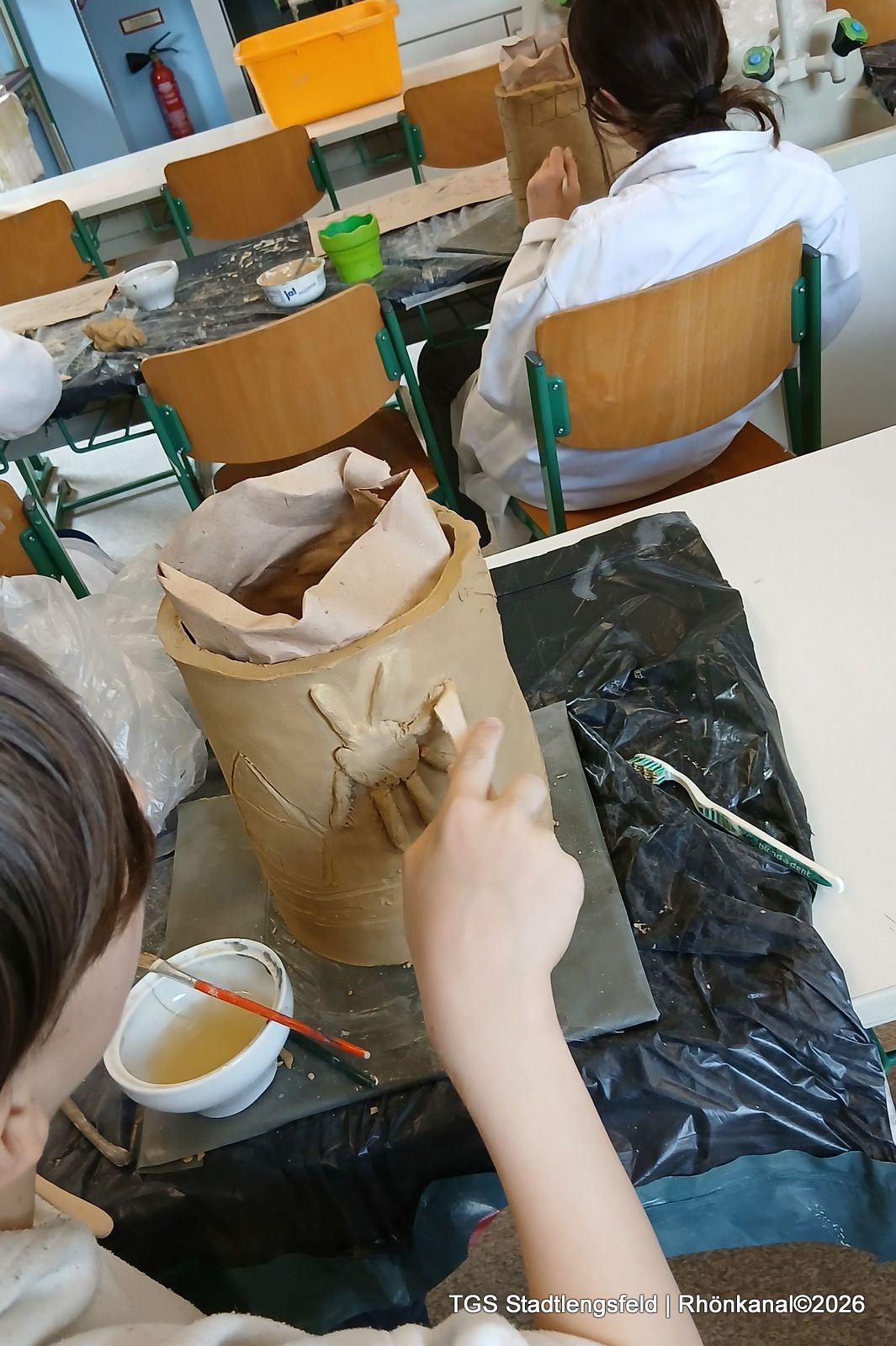 Der dritte Projekttag widmete sich der konkreten Gestaltung der Außenflächen. Die zuvor entwickelten Motive wurden auf die Tonzylinder übertragen und plastisch ausgearbeitet.