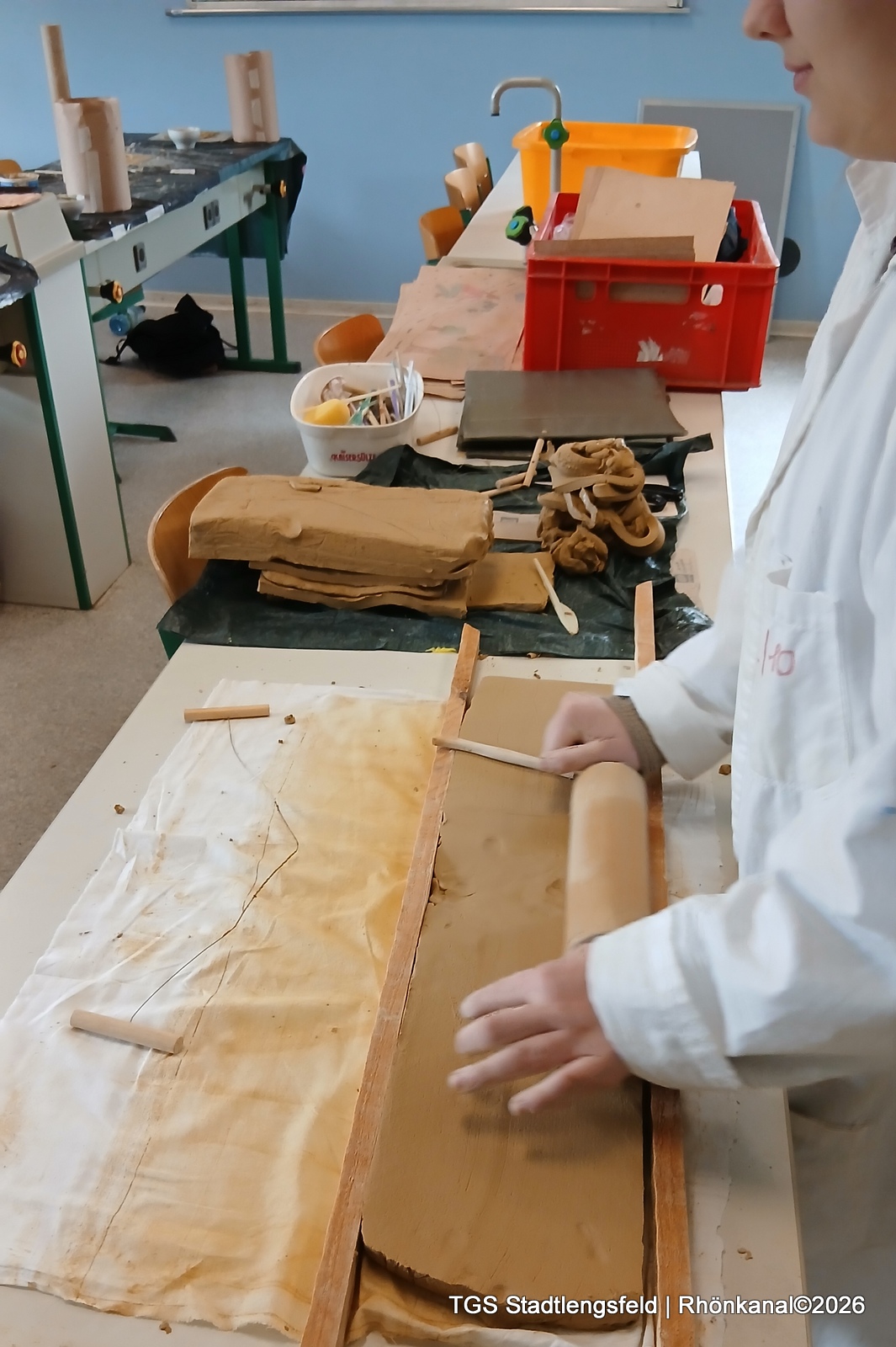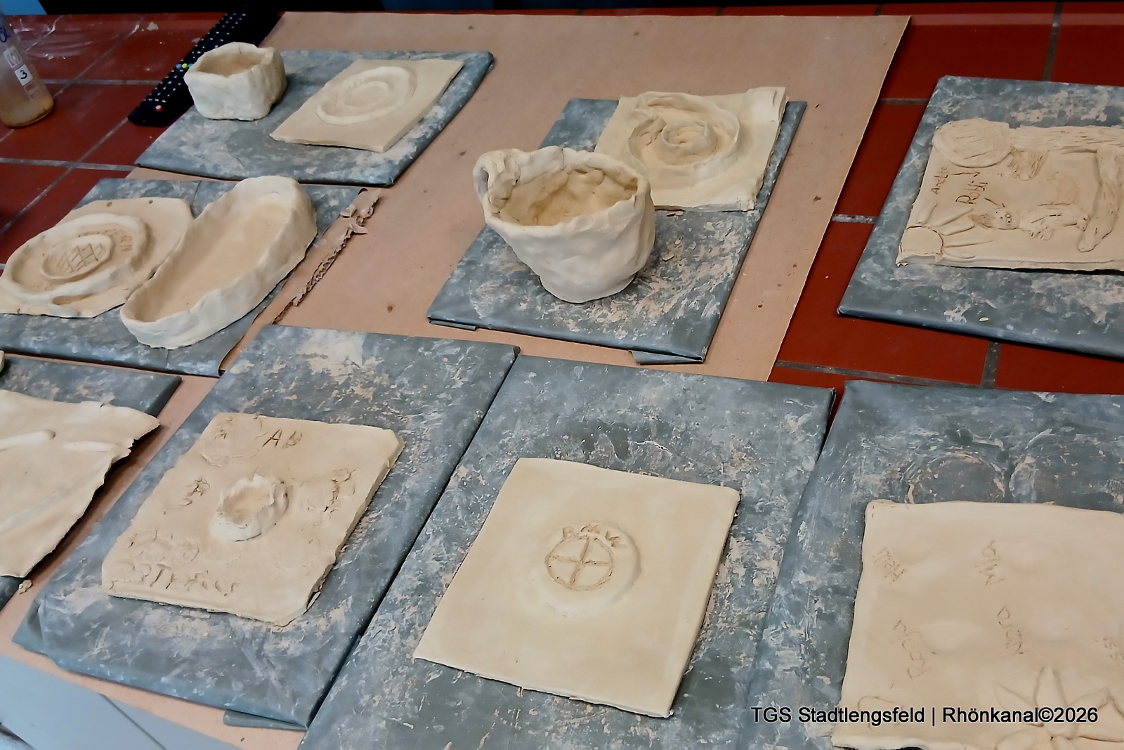 Am zweiten Tag lernten die Teilnehmenden den Werkstoff Ton näher kennen. Sie modellierten kleine Musterkacheln, probierten verschiedene Relieftechniken aus und sammelten erste praktische Erfahrungen. Mithilfe von Rohren entstanden schließlich Zylinder – die Grundform für die späteren Keramikstelen.