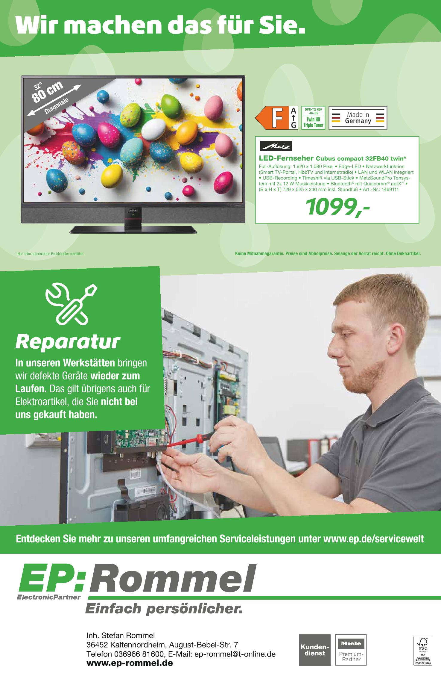 EP:Rommel in Kaltennordheim ist seit vielen Jahre im Geschäft der Elektrobranche tätig. Mit gutem Service, fachgerechter Beratung und Lieferservice zeichnet sich das Unternehmen aus.