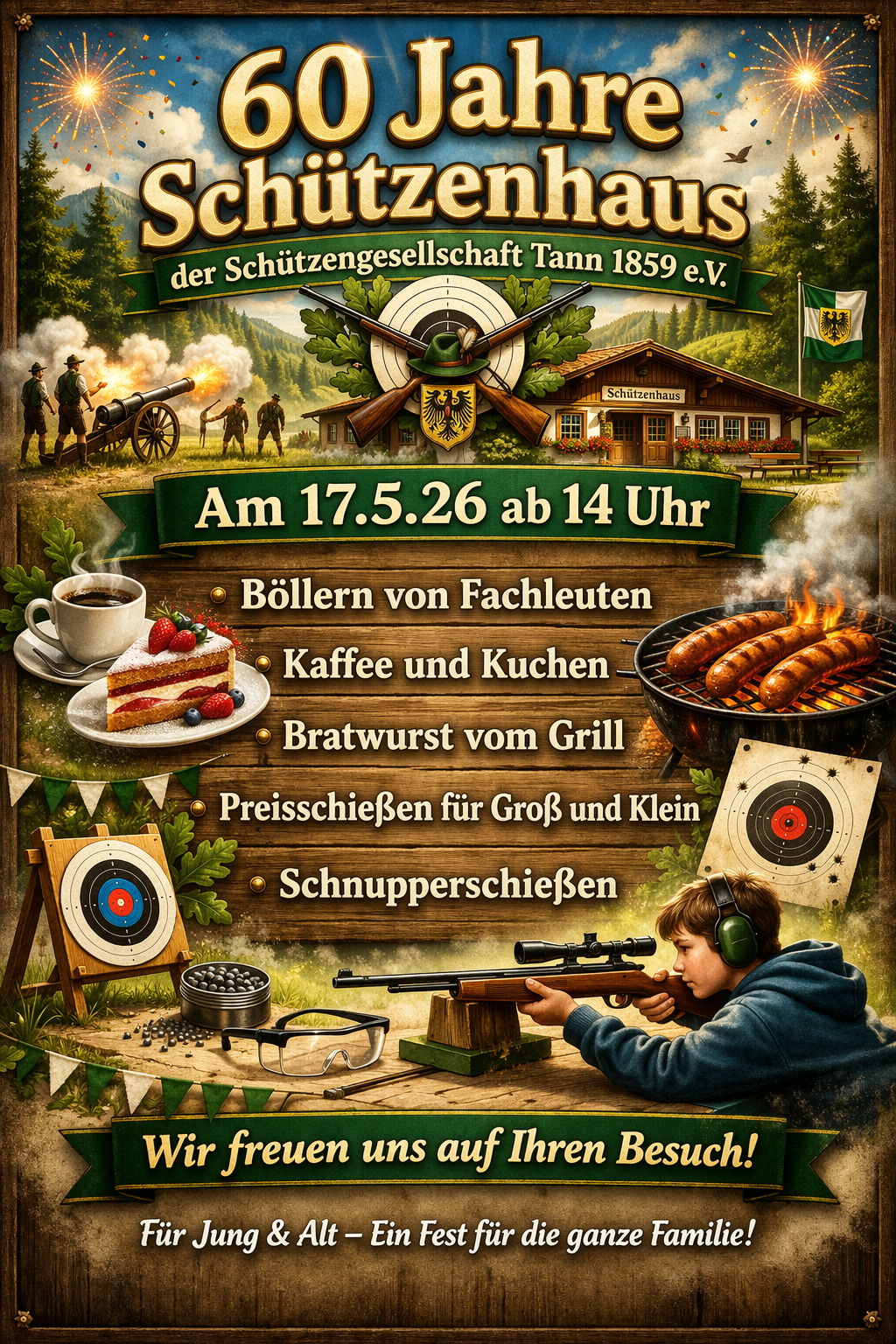 Die Schützengesellschaft Tann 1859 e.V. lädt am Sonntag, den 17. Mai 2026, herzlich ein. Gefeiert wird das Jubiläum „60 Jahre Schützenhaus“.