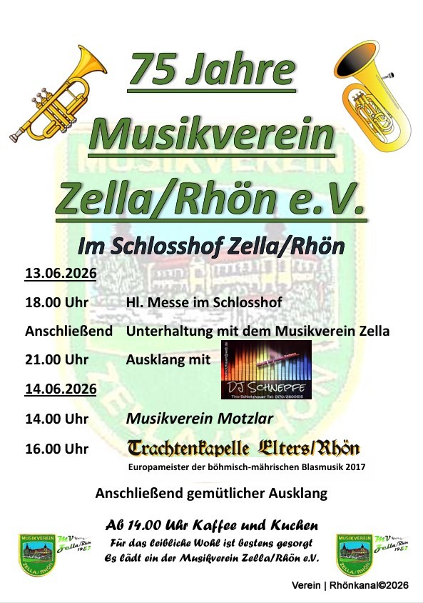 Der Musikverein Zella/Rhön möchte am 13. und 14. Juni 2026 seinen 75-jähriges Bestehen begehen und lädt herzlich zum Mitfeiern ein!