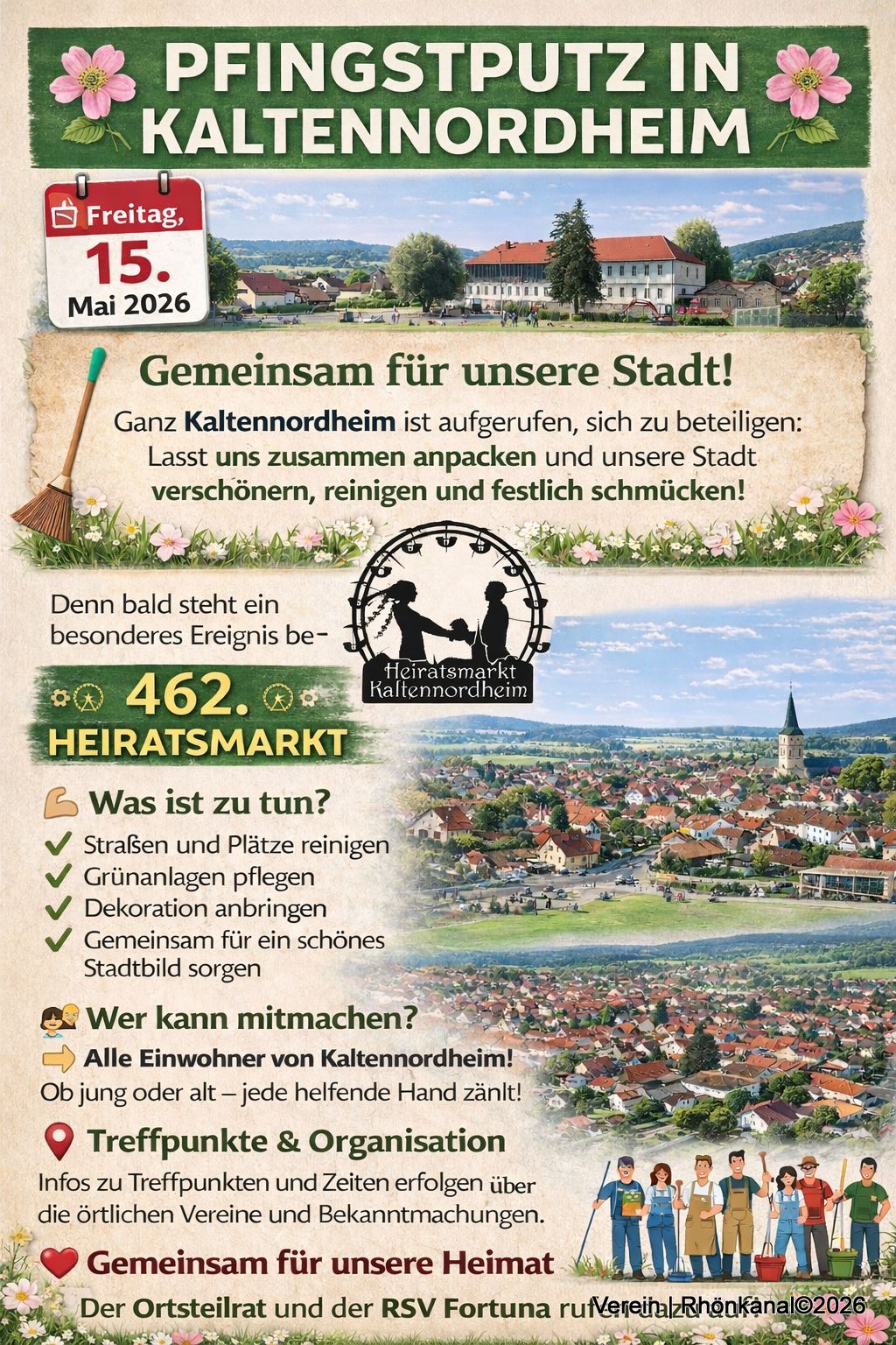 „Gemeinsam für unsere Stadt“ heißt es am Freitag, den 15. Mai 2026, wenn ganz Kaltennordheim dazu aufgerufen ist, sich am Pfingstputz zu beteiligen.