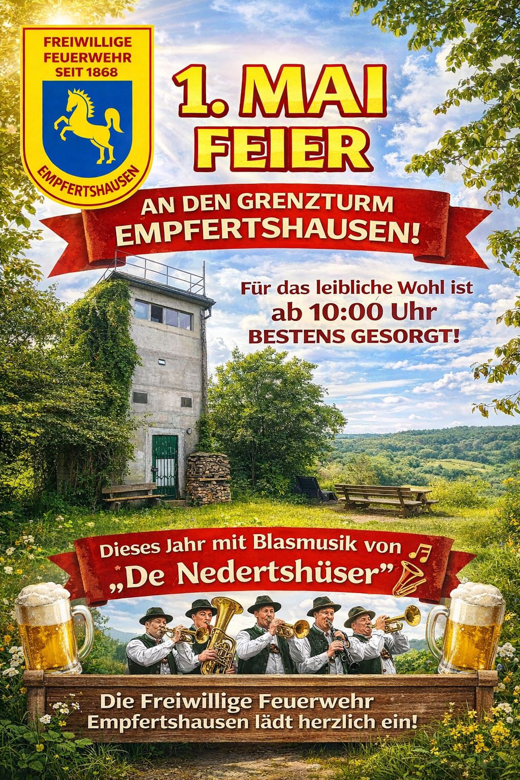 Die Freiwillige Feuerwehr Empfertshausen lädt zur traditionellen Maifeier am Grenzturm ein. Inmitten einer herrlichen Landschaft mit weitem Blick über die Rhön erwartet die Besucher ein entspannter Tag für die ganze Familie.