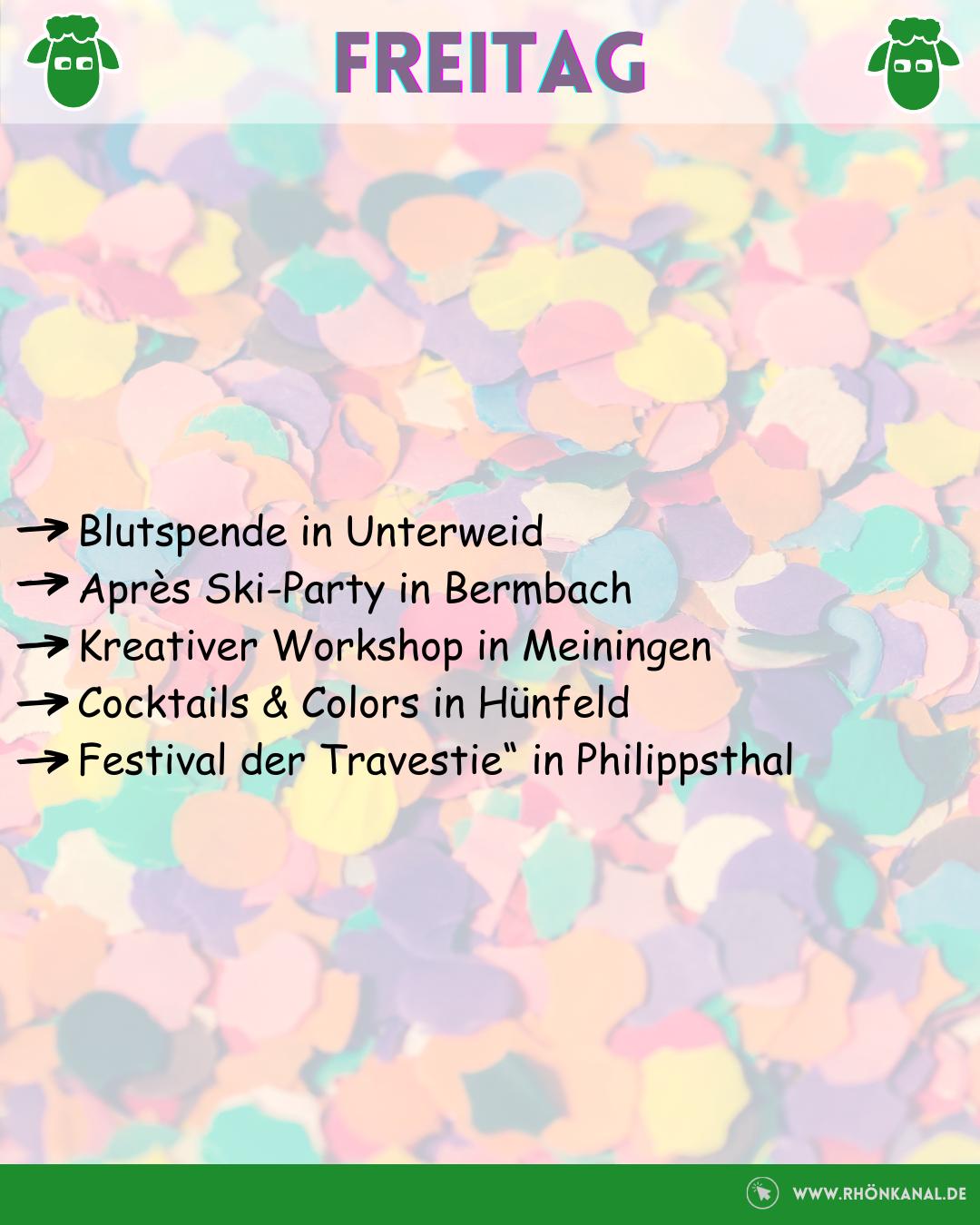 Das Wochenende in der Rhön hat wieder einiges zu bieten: Am Freitag wird es bunt und abwechslungsreich – von der Blutspende in Unterweid über kreative Workshops in Meiningen bis hin zur Après-Ski-Party in Bermbach und dem „Festival der Travestie“ in Philippsthal.