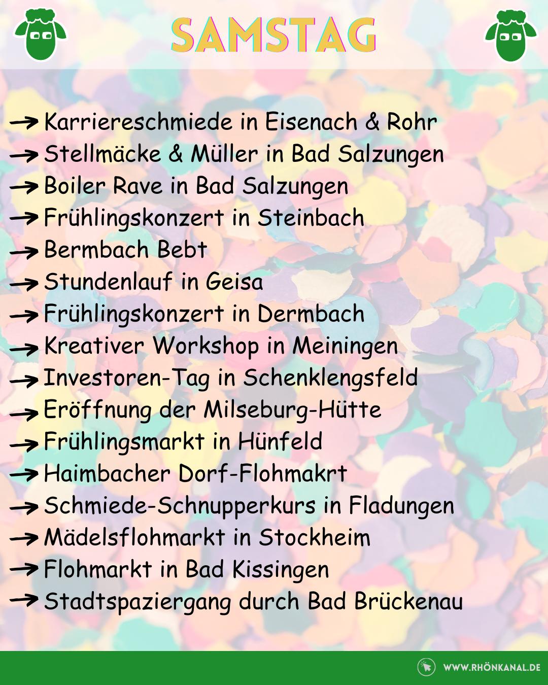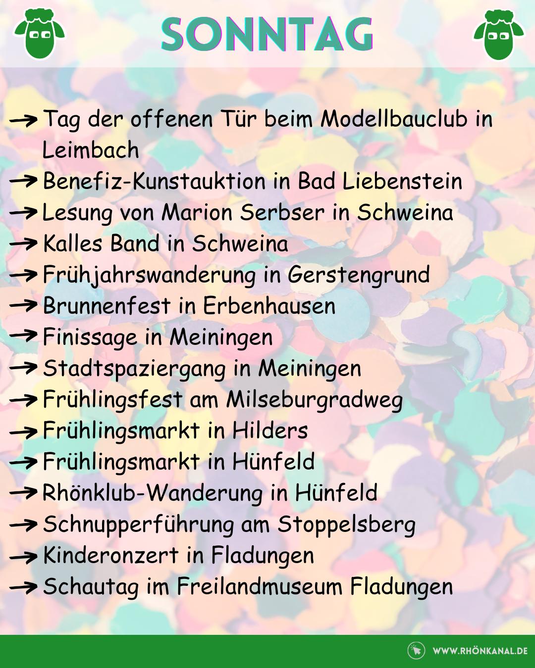 Am Sonntag wird es dann etwas ruhiger, aber nicht weniger spannend: Von der Frühjahrswanderung in Gerstengrund über das Brunnenfest in Erbenhausen bis hin zu Kunst, Kultur und Familienangeboten wie dem Schautag im Freilandmuseum Fladungen ist alles dabei.