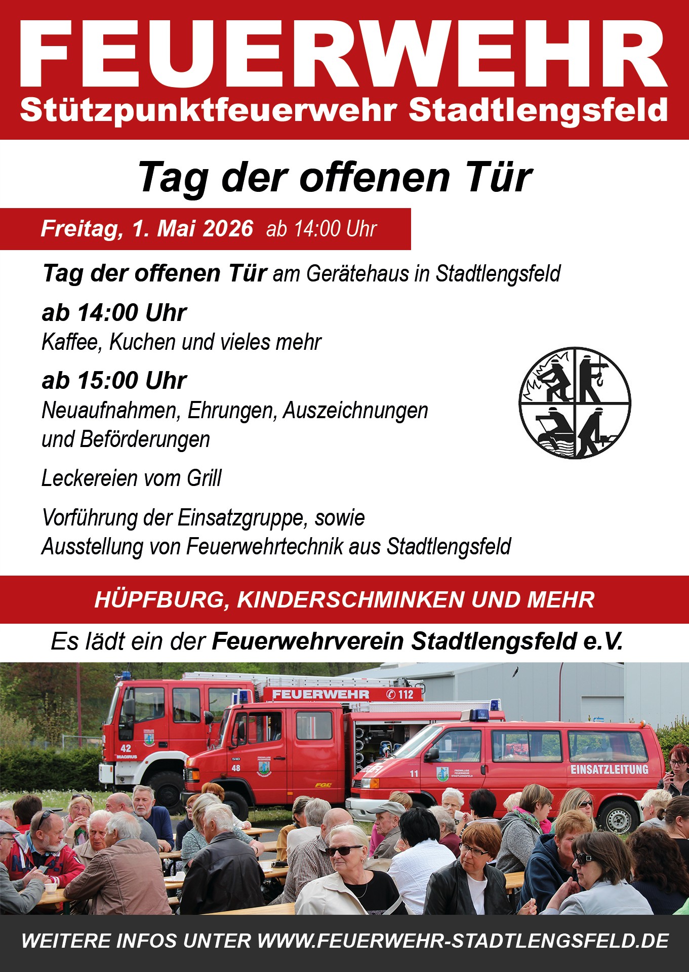Die Stützpunktfeuerwehr Stadtlengsfeld lädt am Freitag, 1. Mai 2026, ab 14:00 Uhr zum Tag der offenen Tür am Gerätehaus ein. Geboten wird ein geselliger Nachmittag, der Einblicke in die Arbeit der Wehr mit Unterhaltung für die ganze Familie verbindet.