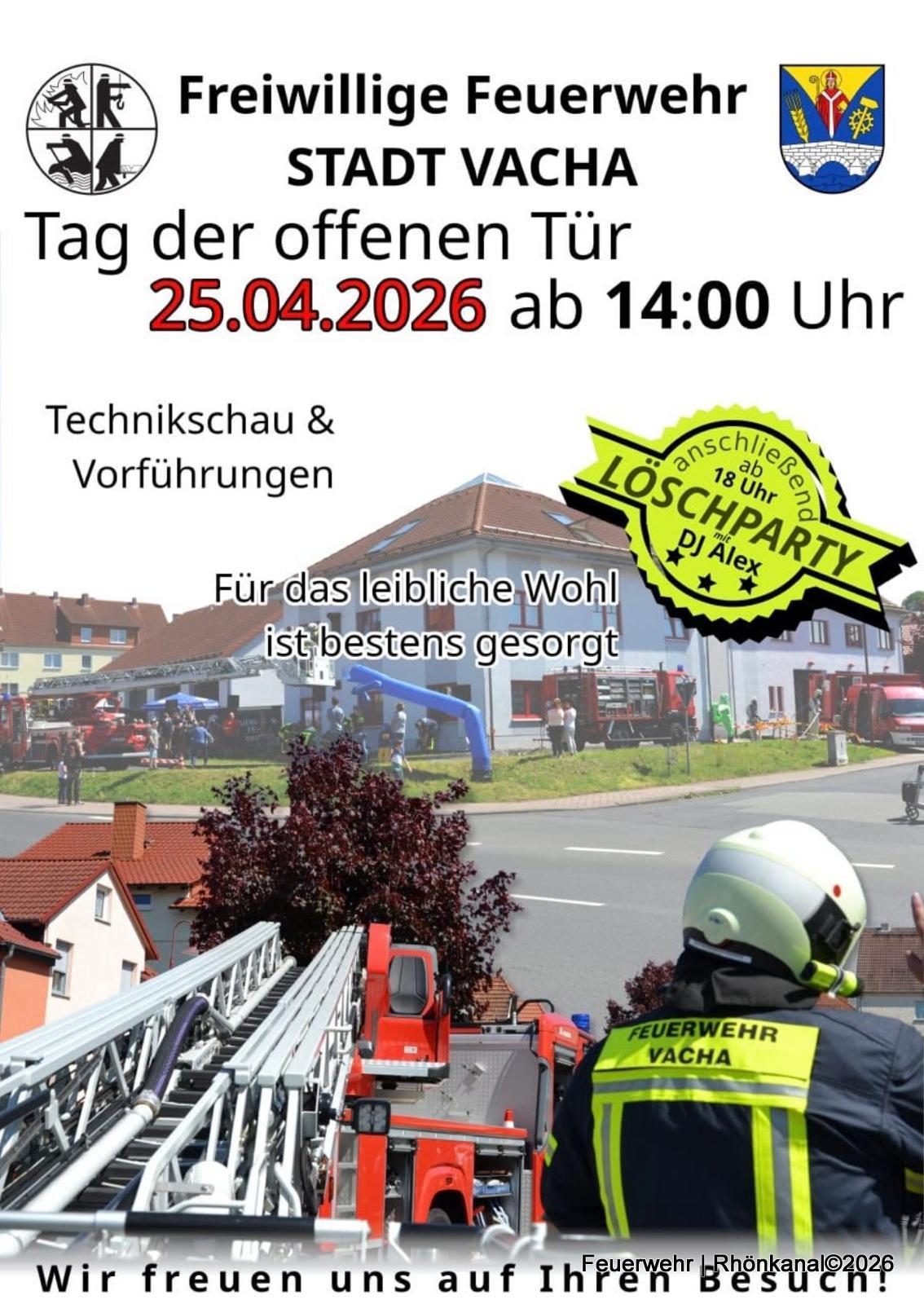Die Freiwillige Feuerwehr Vacha sowie der Feuerwehrverein Vacha 1937 e.V. laden alle Interessierten am Samstag, den 25. April 2026, herzlich zum Tag der offenen Tür ein.