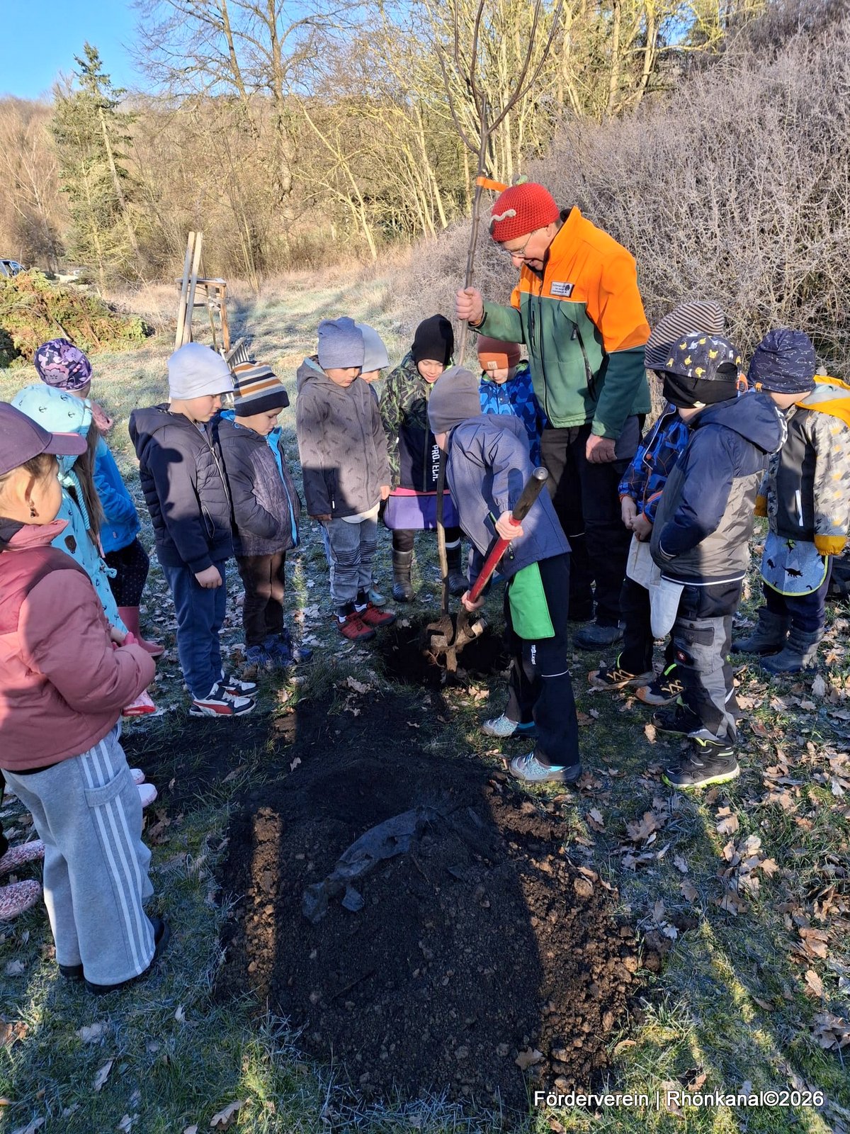 Die Kinder beteiligten sich mit großer Begeisterung und Engagement an allen Aktivitäten. Dank der vielen helfenden Hände verwandelte sich die Fläche Schritt für Schritt in eine kleine Streuobstwiese, die künftig nicht nur Schatten und Lebensraum bietet, sondern auch zum Naschen einlädt.