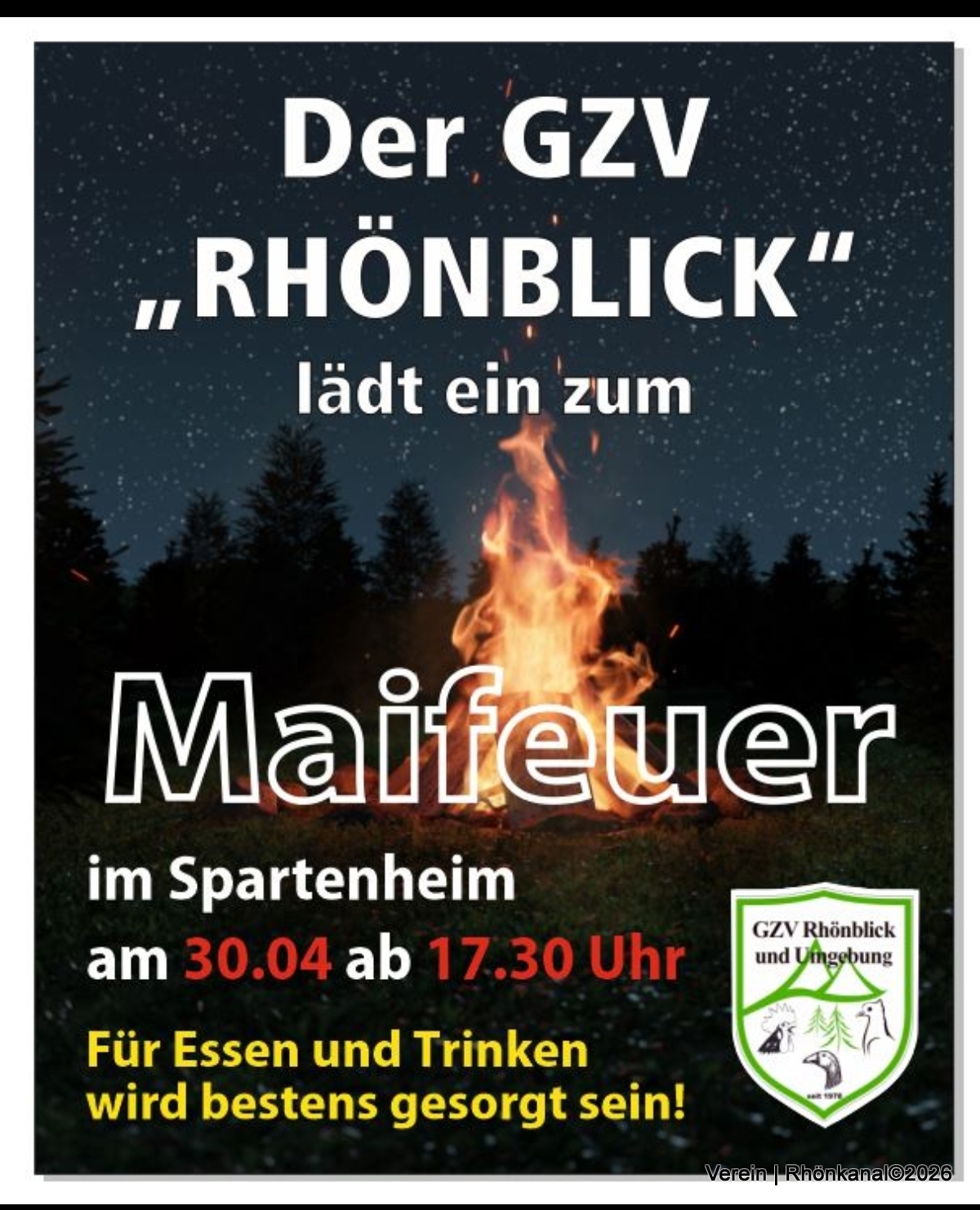 Gemütlichkeit am Spartenheim – Maifeuer in Bettenhausen 30.4.26 Posted by Redaktion25. April 2026 Der GZV Rhönblick lädt am Donnerstag, den 30. April 2026, herzlich zum traditionellen Maifeuer am Spartenheim Bettenhausen ein. Beginn ist um 17.30 Uhr. Für das ausreichend Essen und Getränke sowie eine angenehme Atmosphäre ist bestens gesorgt.
