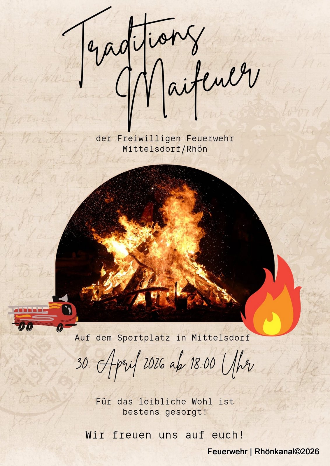 Die Freiwillige Feuerwehr Mittelsdorf lädt am Donnerstag, den 30. April 2026, herzlich zum traditionellen Maifeuer ein. Beginn ist um 18 Uhr auf dem örtlichen Sportplatz.