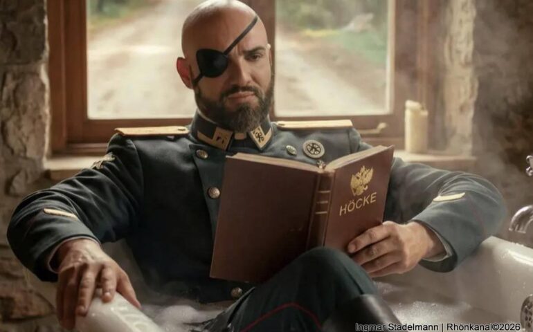Mit seinem satirischen Diskurs widmet sich Stadelmann ganz und gar den bizarren Verwerfungen und Versprechungen, den Worten und dem Werdegang des AfD-Chefs aus Thüringen.