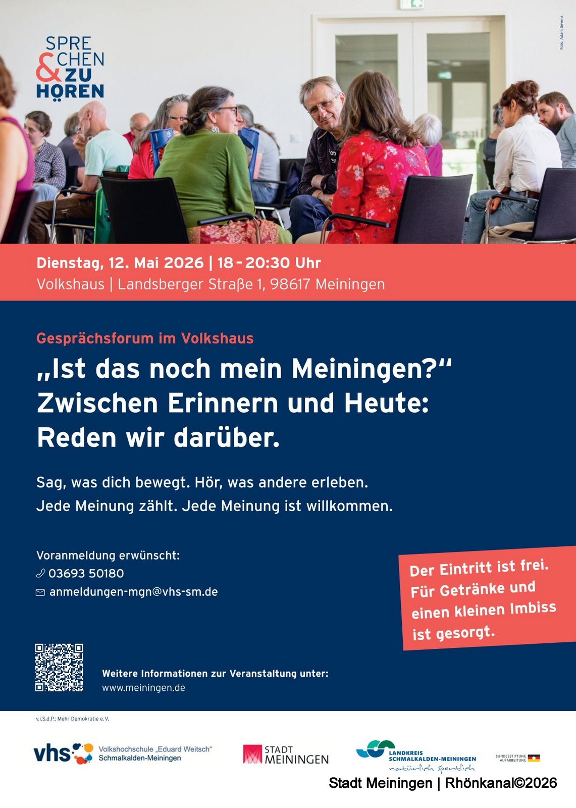Am Dienstag, dem 12. Mai 2026, laden die Stadt Meiningen und die Volkshochschule Schmalkalden‑Meiningen von 18 bis 20.30 Uhr ins Volkshaus Meiningen ein.