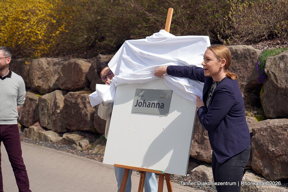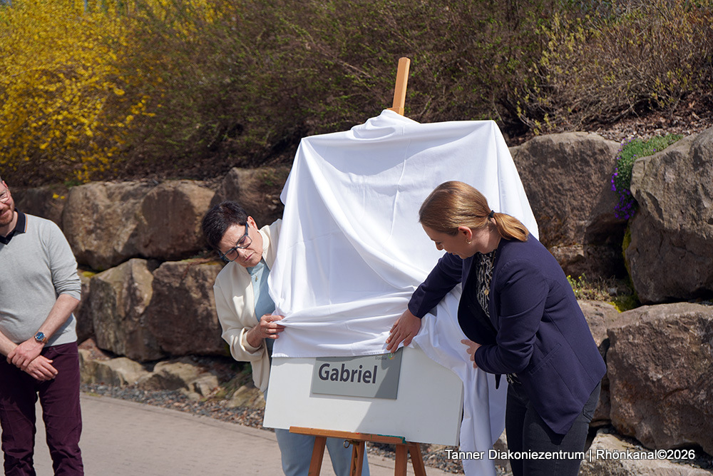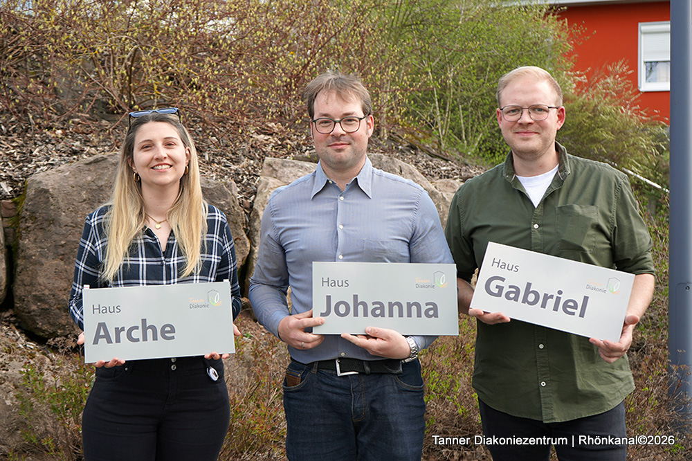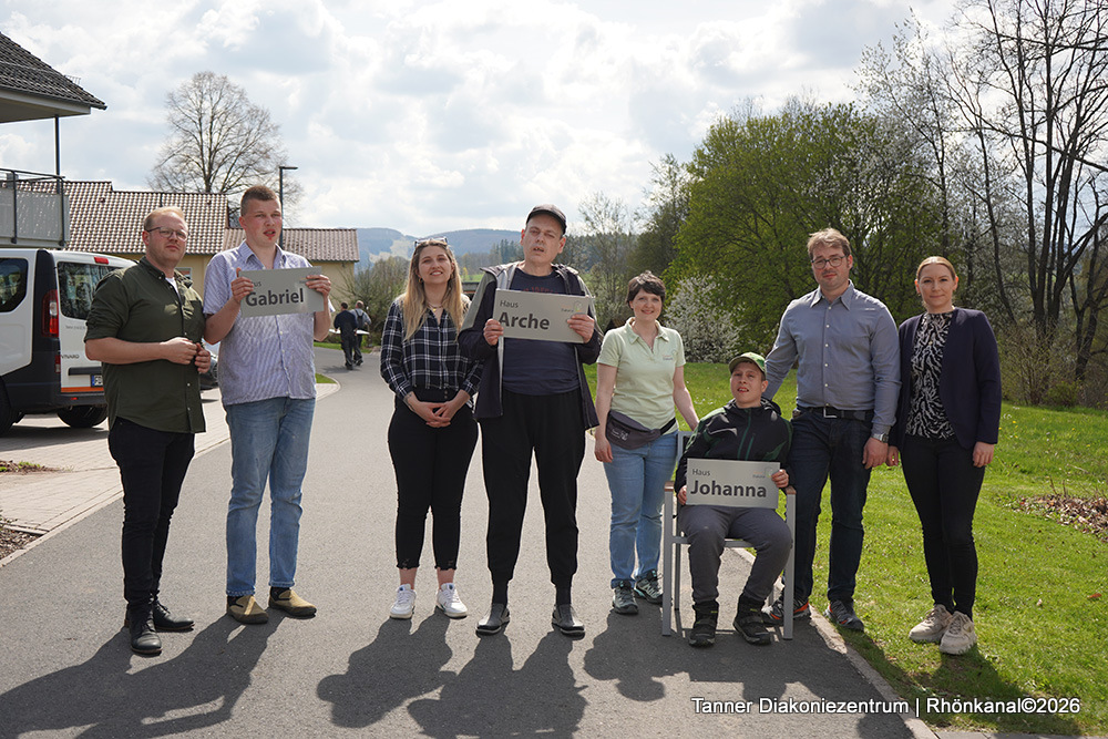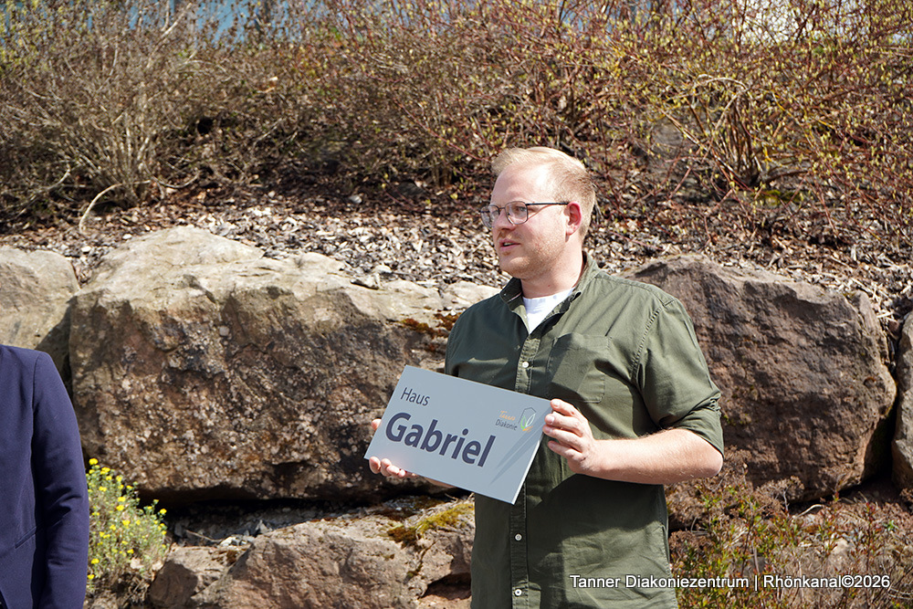 Teamleitung Lukas Moeller aus dem bisherigen Wohnhaus 3 nahm das Schild „Haus Gabriel“ entgegen und erklärte: „Gabriel bedeutet ‚Gott ist meine Stärke“ – Stärke können wir gut gebrauchen.“ Das Wohnhaus 2 trägt künftig den Namen „Haus Johanna“.