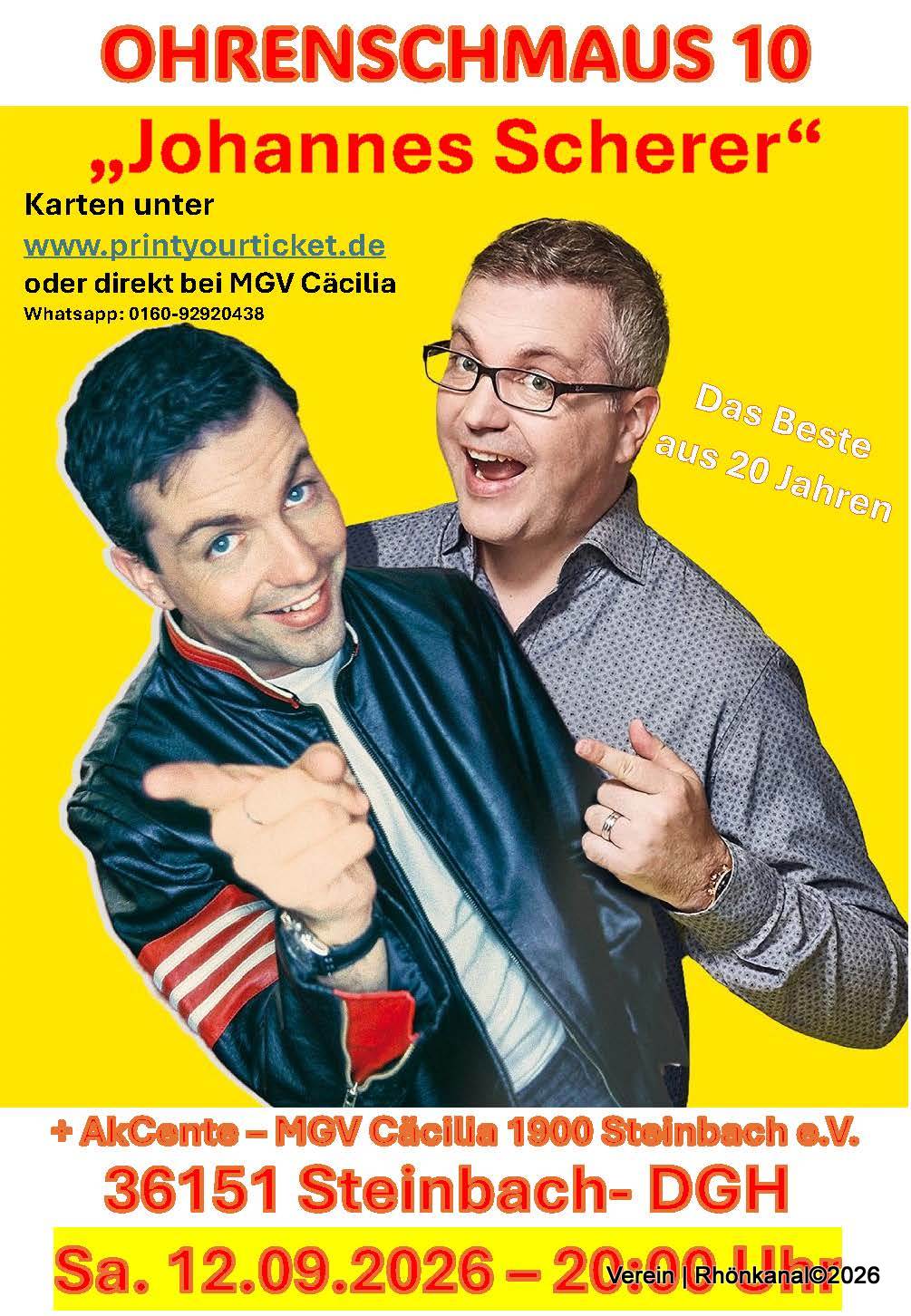 Johannes Scherer hat genau das geschafft – und bringt nun sein Erfolgsrezept in einer großen „Best Of“-Show am Samstag, den 12. September 2026, um 20 Uhr,  ins DGH nach Steinbach (Burghaun) – und wie bei jedem Ohrenschmaus wird der gemischte Chor AkCente des MGV Cäcilia 1900 Steinbach e.V. den Abend mit Liedbeiträgen bereichern.