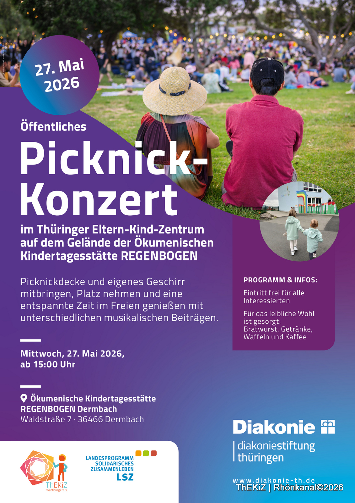 Am Mittwoch, den 27. Mai 2026 lädt das Thüringer Eltern-Kind-Zentren (ThEKiZ) auf dem Gelände der Ökumenischen Kindertagesstätte REGENBOGEN in Dermbach zu einem öffentlichen Picknick-Konzert ein.