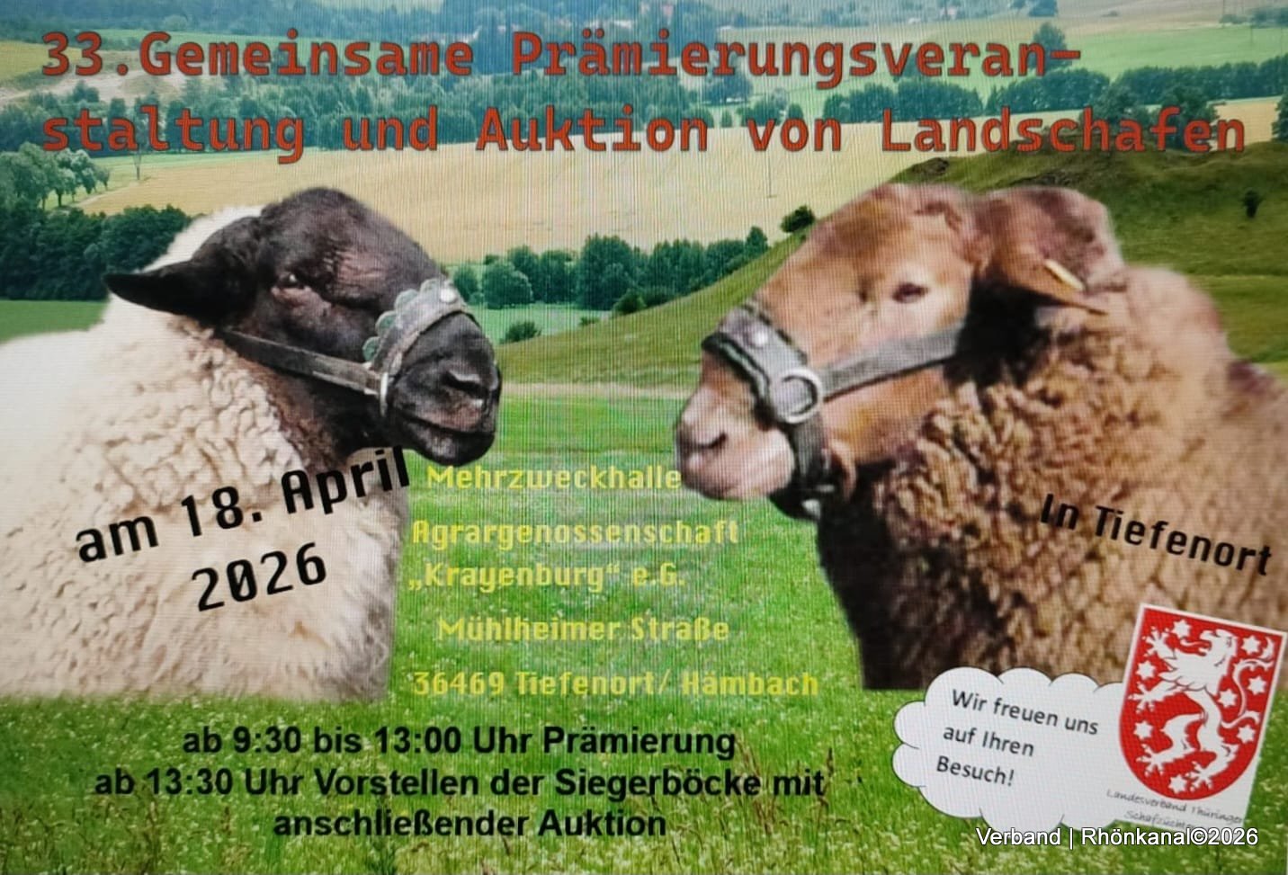 Am Samstag, den 18. April 2026, findet ab 9:30 Uhr in der Mehrzweckhalle Agrargenossenschaft "Krayenberg" e.G. die 33. Gemeinsame Prämierungsveranstaltung und Auktion von Landschafen statt.