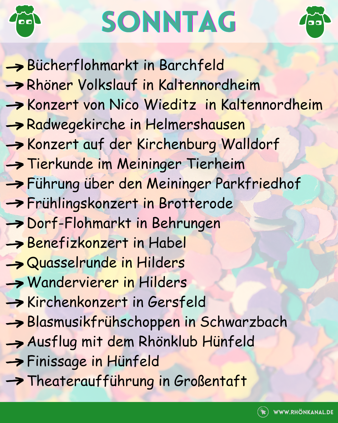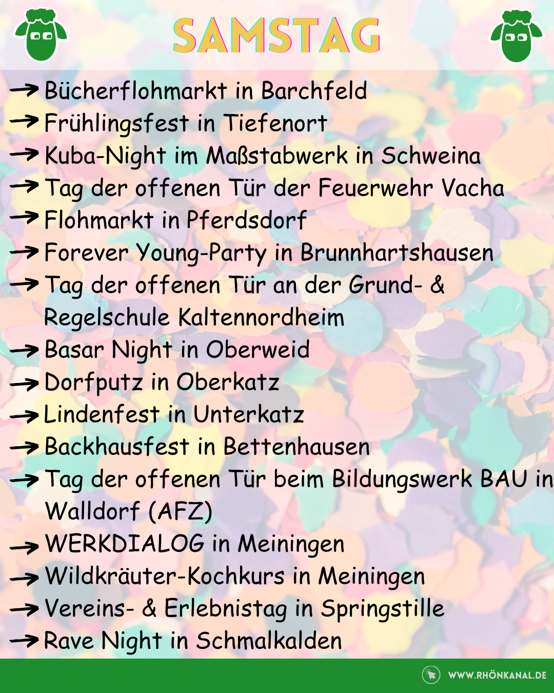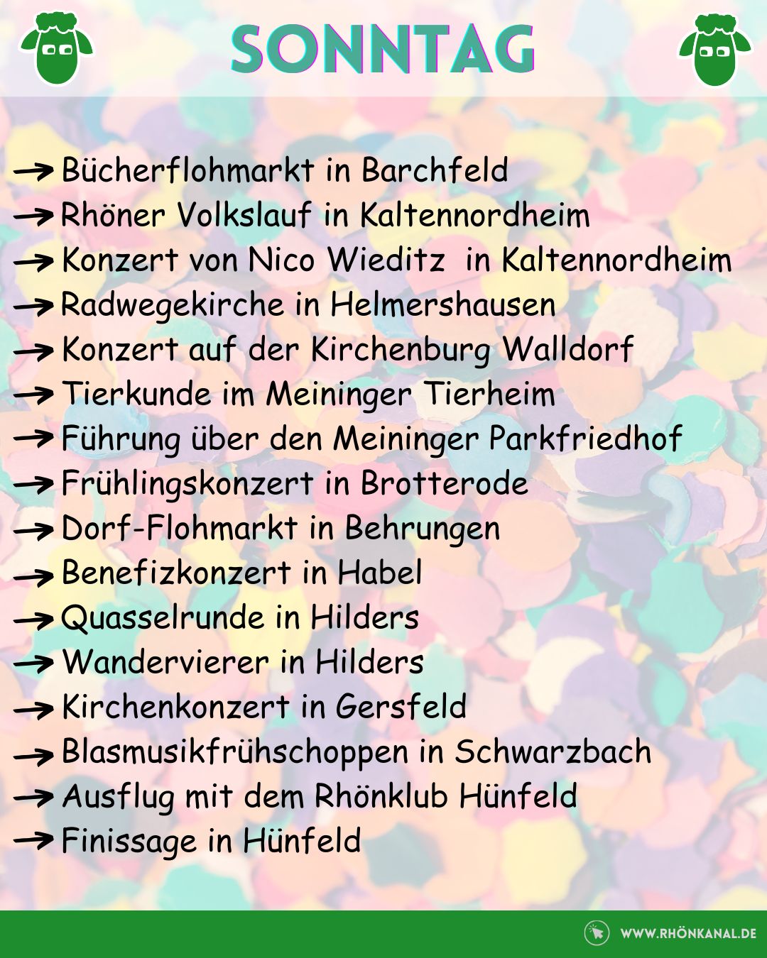 Schnäppchenjäger kommen bei den Flohmärkten in Urnshausen, Oberweid, Pferdsdorf und Barchfeld voll auf ihre Kosten. Für musikalische und gesellige Highlights sorgen beispielsweise die Forever Young Party in Brunnhartshausen, das Elevation Event auf der Wasserkuppe sowie diverse Kirchenkonzerte und Frühlingsfeste.