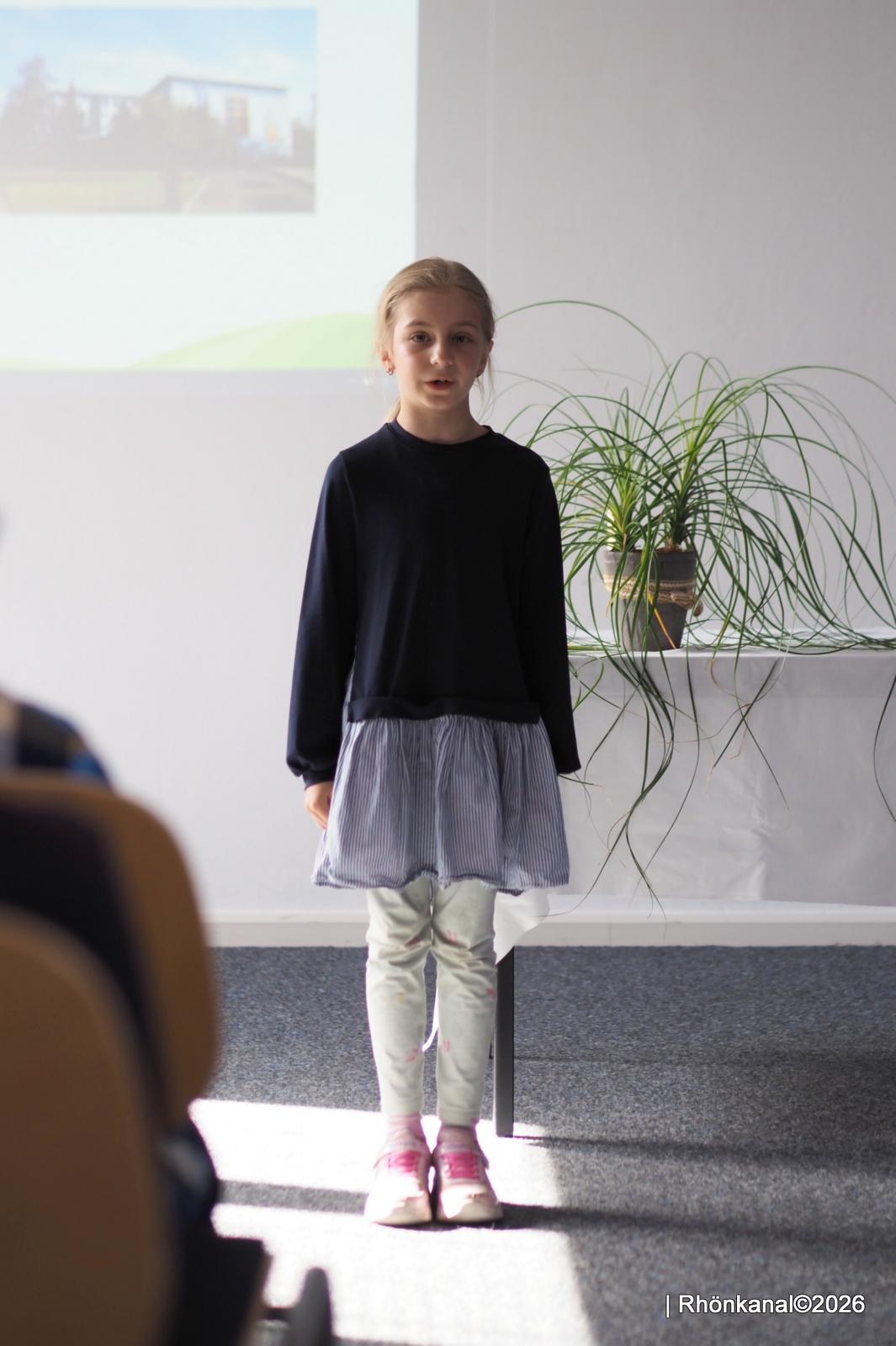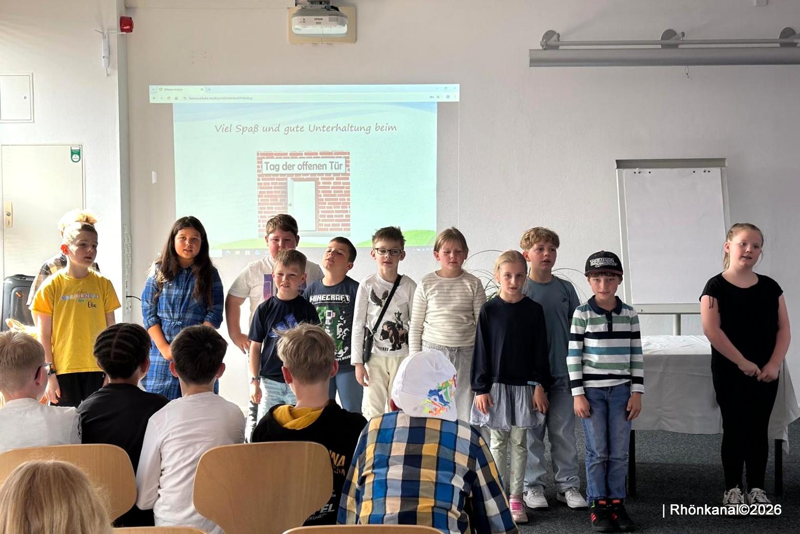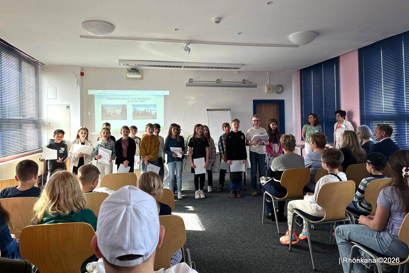 Die Klassen 2 und 3 sangen unter der Leitung von Musiklehrerin Frau Goerge für die Besucher in der Aula. Weitere Gedichte folgten und wurden mit kräftigem Applaus belohnt.