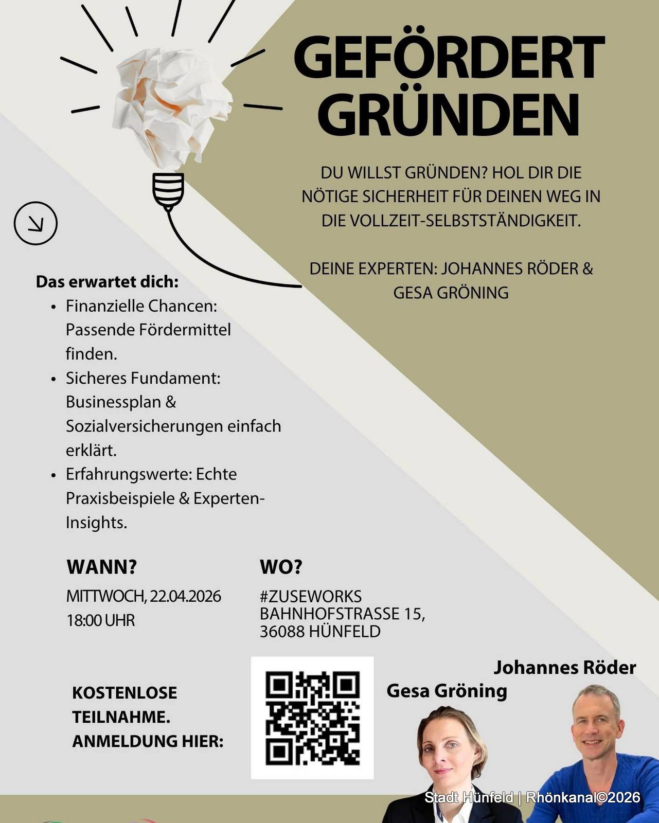 Als Referenten stehen Gesa Gröning vom Unternehmer:innen-Circle und Unternehmensberater Johannes Röder zur Verfügung. Geklärt werden können Fragen rund um Fördermittel für Gründer, die Erstellung eine Businessplans und Erläuterungen zur Sozialversicherung.
