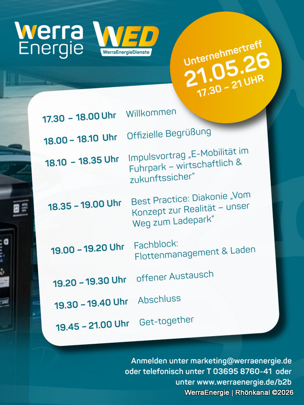 Die Veranstaltung findet am Donnerstag, den 21. Mai 2026, von 17:30 bis 21:00 Uhr bei WerraEnergie in Bad Salzungen statt.