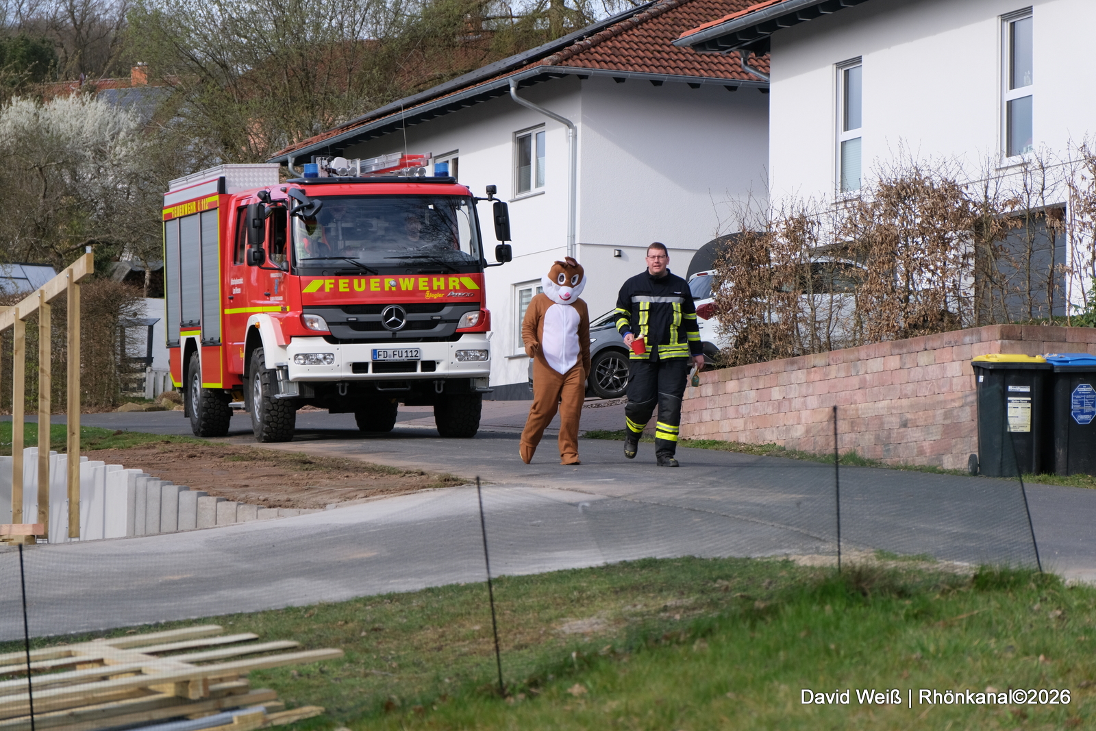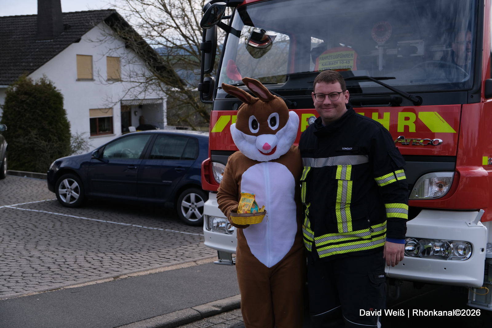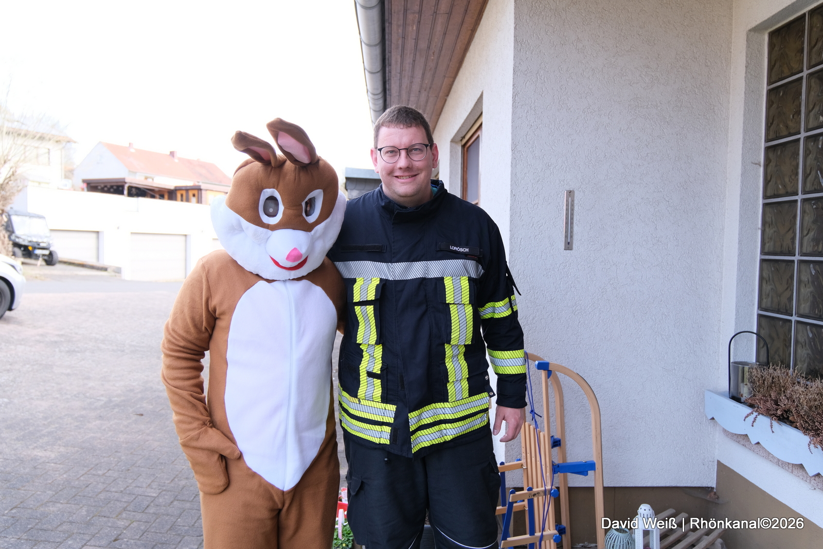 Gemeinsam mit dem Osterhasen machten sich die Feuerwehrkameraden auf den Weg durch das Dorf. An insgesamt 20 Haustüren hielt der Osterhase in Begleitung der Feuerwehr an und überraschte rund 50 Kinder mit liebevoll vorbereiteten Osternestern.