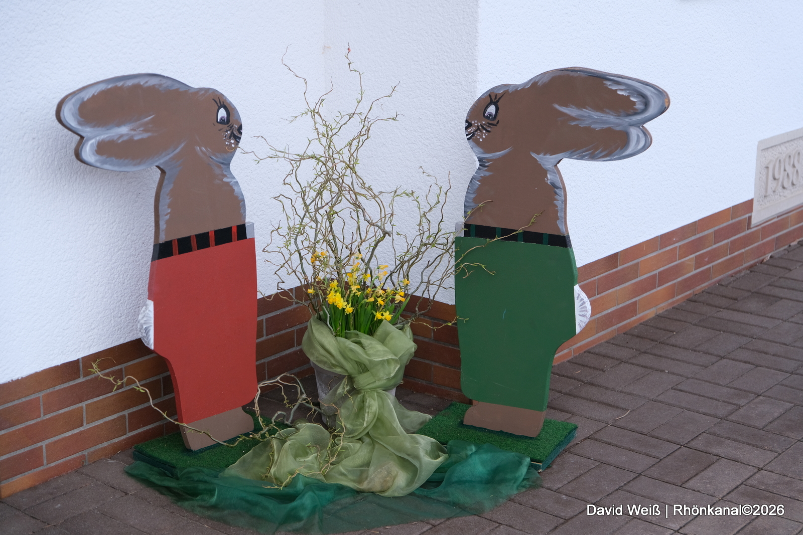 Bei gutem Osterwetter fuhr der Osterhase gemeinsam mit seiner Begleitung durch das gesamte Dorf und verteilte die Körbchen persönlich an die Kinder.