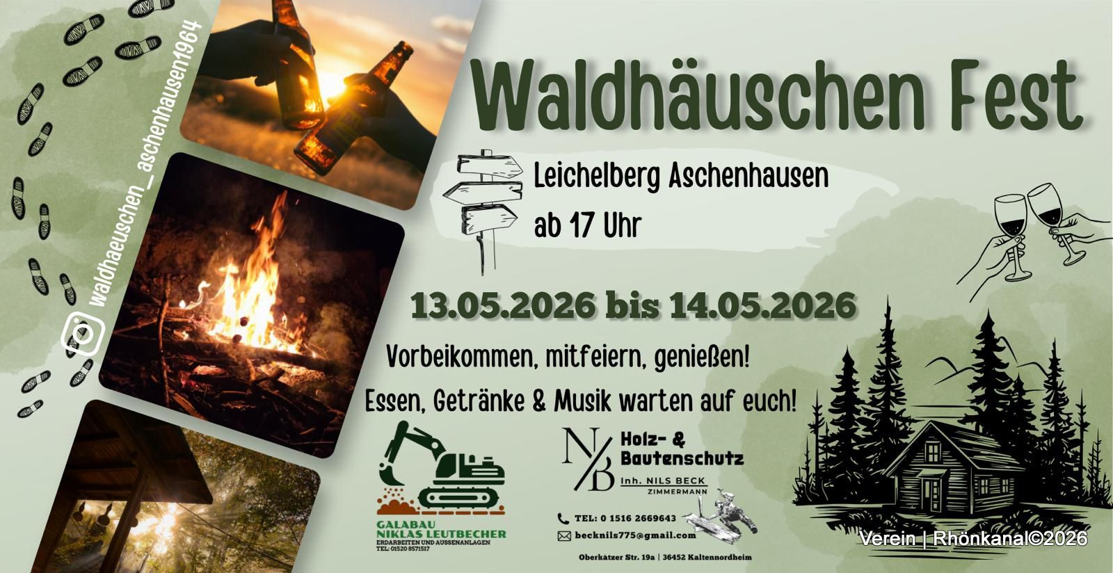 Am Mittwoch vor Himmelfahrt, am 13. Mai 2026, wird herzlich zum Waldhäuschen-Fest am Leichelberg Aschenhausen eingeladen. Ab 17 Uhr stehen Essen und Getränke bereit.