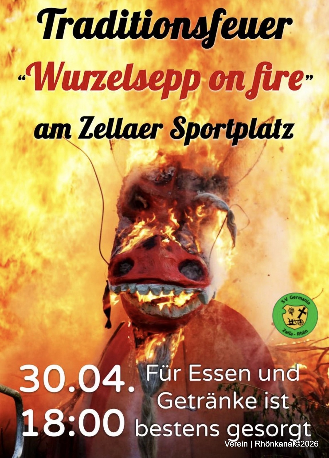 Am Donnerstag, den 30. April, wird es ab 18 Uhr wieder stimmungsvoll am Zellaer Sportplatz: Der SV Germania Zella/Rhön lädt zum Traditionsfeuer „Wurzelsepp on fire“ ein.