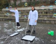 Bereits am Empfang wurden die Gäste freundlich und kompetent von den Gymnasiasten Clemens Hohmann und Konrad Reifert aus der Klasse E1G1 willkommen geheißen. Ein farbenfroher Blickfang waren beeindruckende Riesenseifenblasen, vorbereitet vom Leistungskurs.