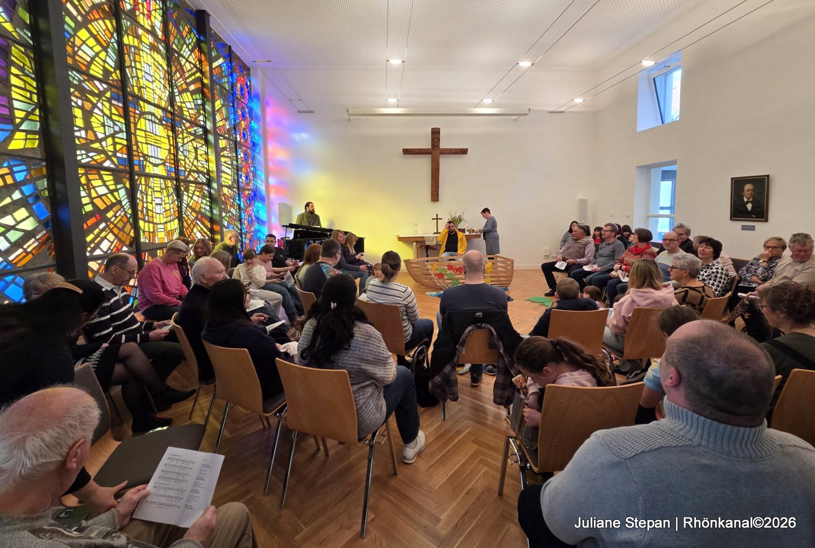 Das lebensgroße Kruzifix erhob sich inmitten der musikalischen Akteure und war durch Illumination eindrucksvoll in Szene gesetzt.